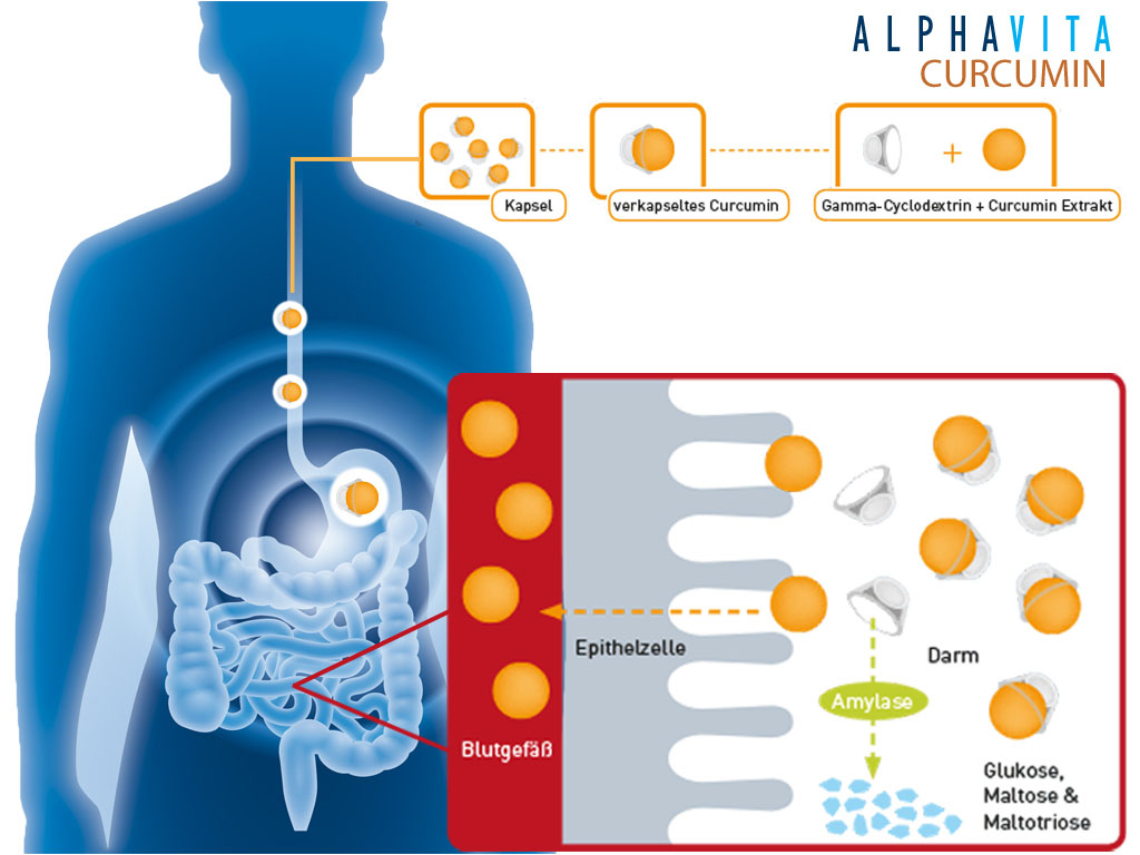 CAVACURMIN® wird über den Magen in den Dünndarm transportiert. Von dort gelangen die Moleküle über die Epithelzellen des Dünndarms ins Blut und können über die Blutgefäße im gesamten Körper transportiert werden. Das Enzym Amylase spaltet (hydrolisiert) anschließen das Oligosaccharid Gamma-Cyclodextrin, welche als Matrix für die Aufnahme fungiert, erst zu Maltose und Maltotriose und anschließend erfolgt die Umwandlung zu Glukose.