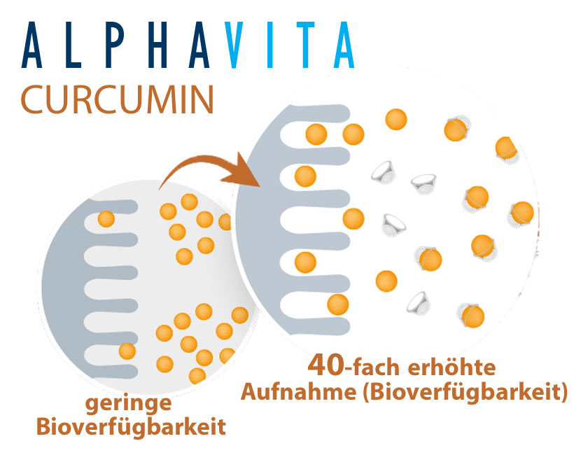 ALPHAVITA CURCUMIN enthält ein hoch bioverfügbares Komplex CAVACURMIN® - welcher rund 40-mal effizienter absorbiert wird als reines Curcumin-Pulver oder einige kommerzielle Curcumin-Ergänzungsmittel.